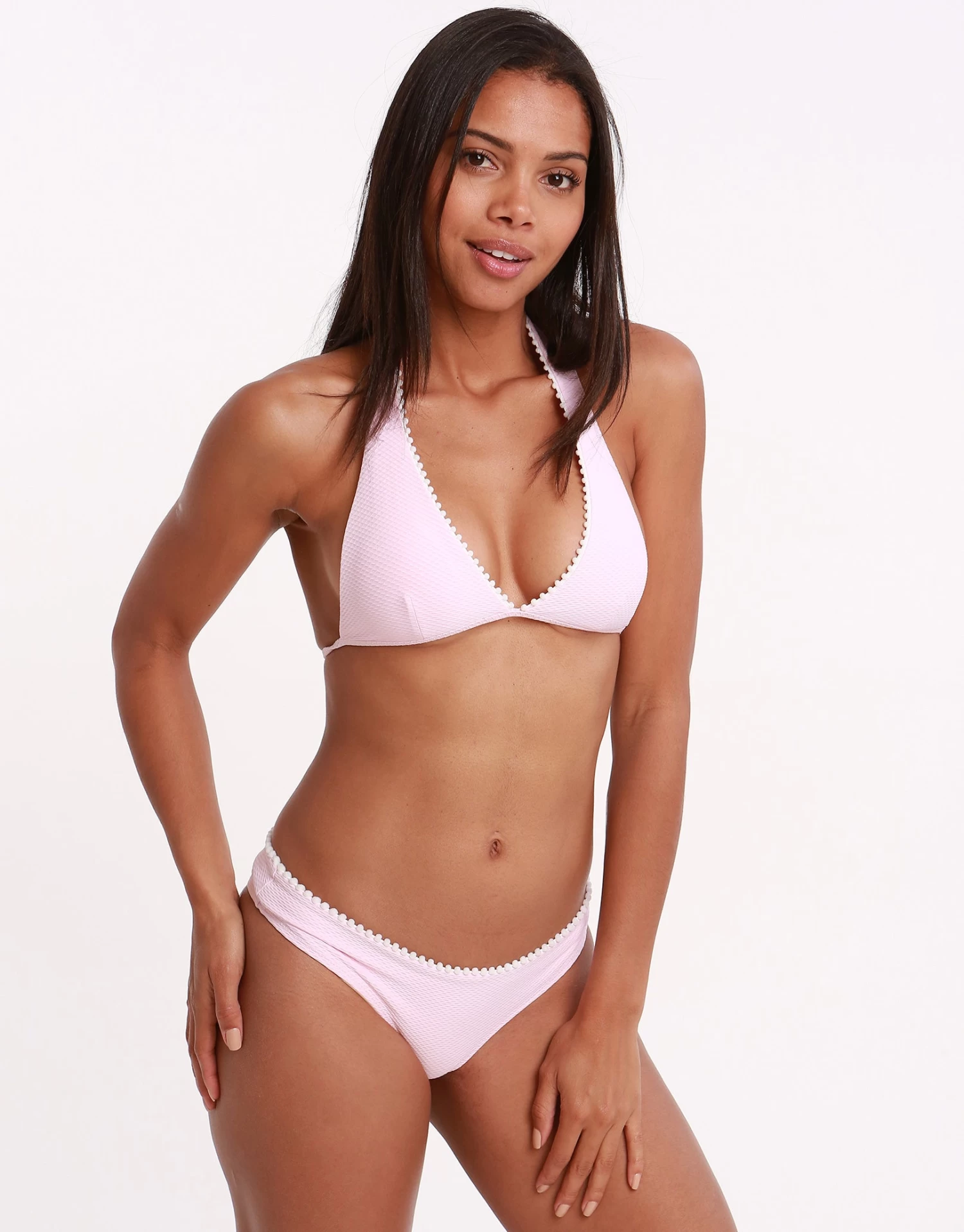 Complete your bikini in the Heidi Kelin Amelia Island Pom Pom Hipster Bikini Bottom in Light Pink.