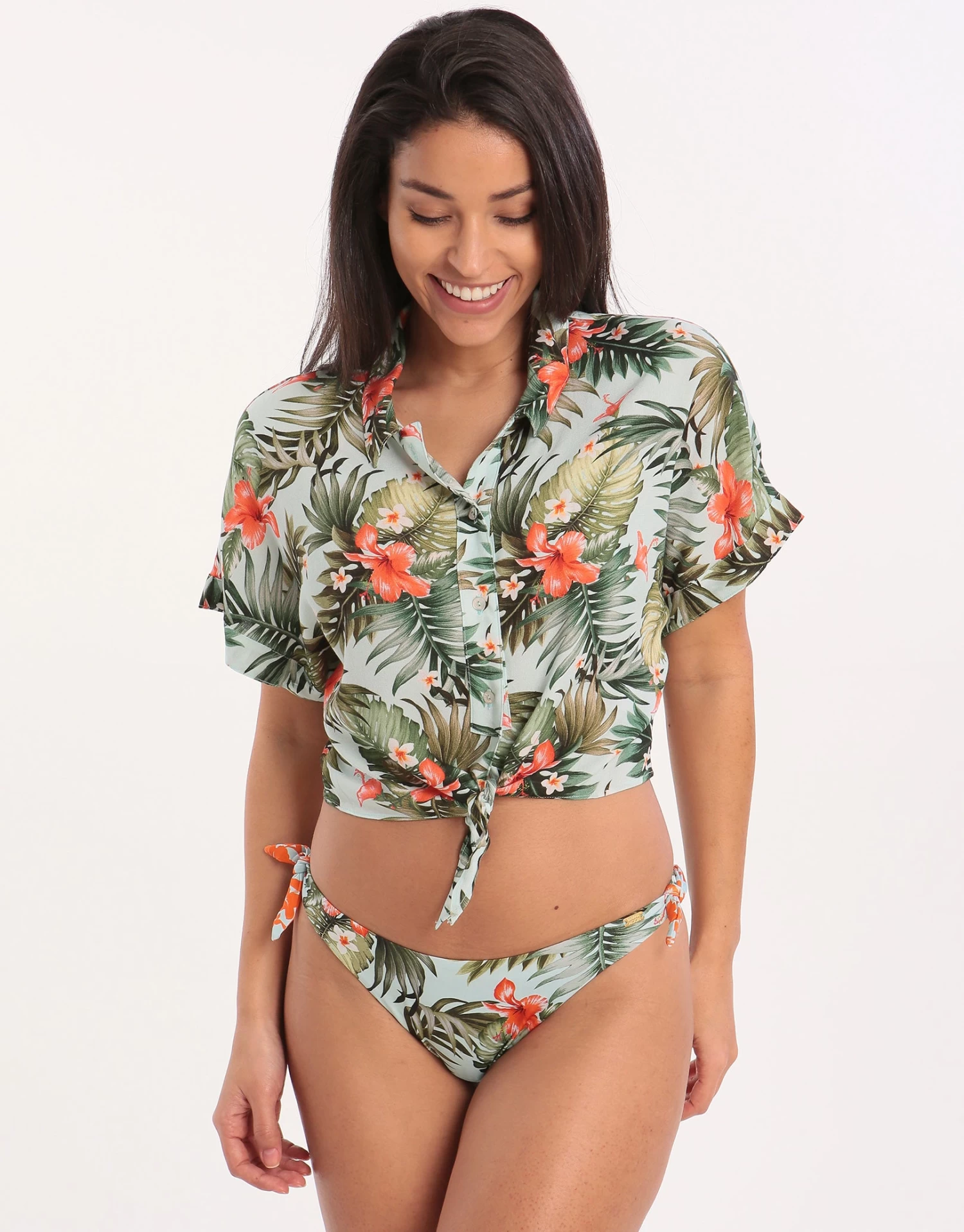 Get ready for the day’s excursion wearing Banana Moon’s Iquitosvoil Kaimi Cropped Shirt in a tropical print. This shirt is great for keeping you cool and stylish on your travels.Â