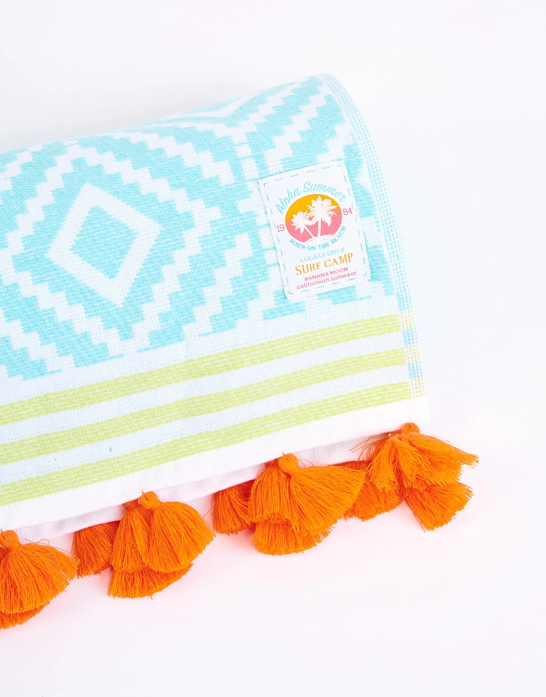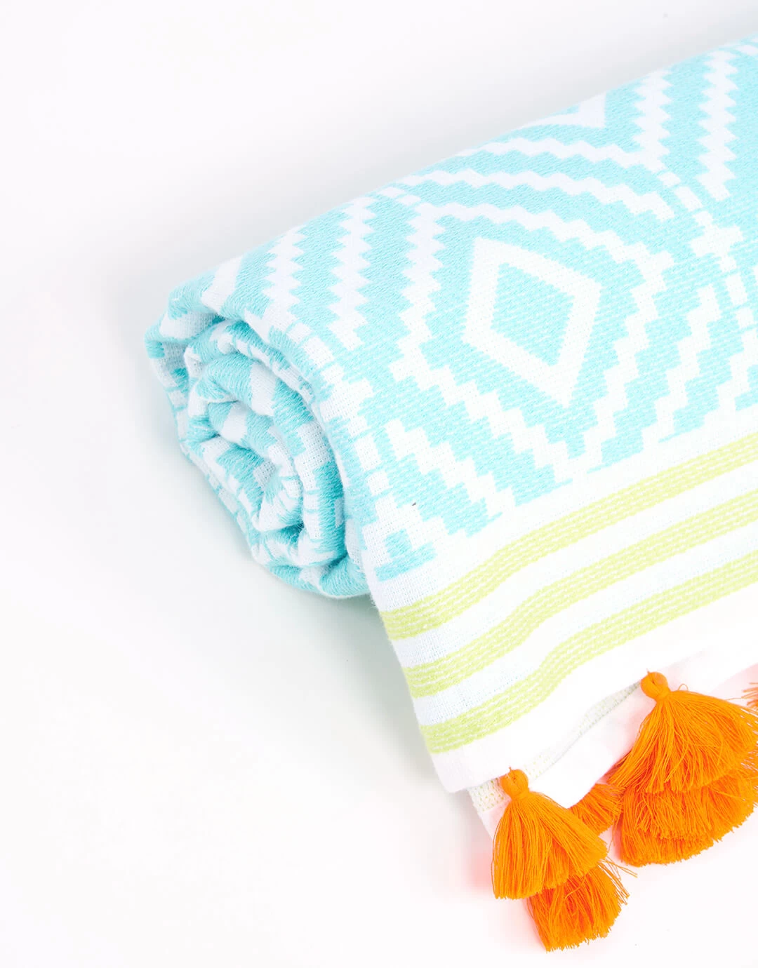 The Marbella Nancy towel in Aqua blue from Banana Moon is a beautifully patterned Hammam-style cotton towel with tasseled edging.