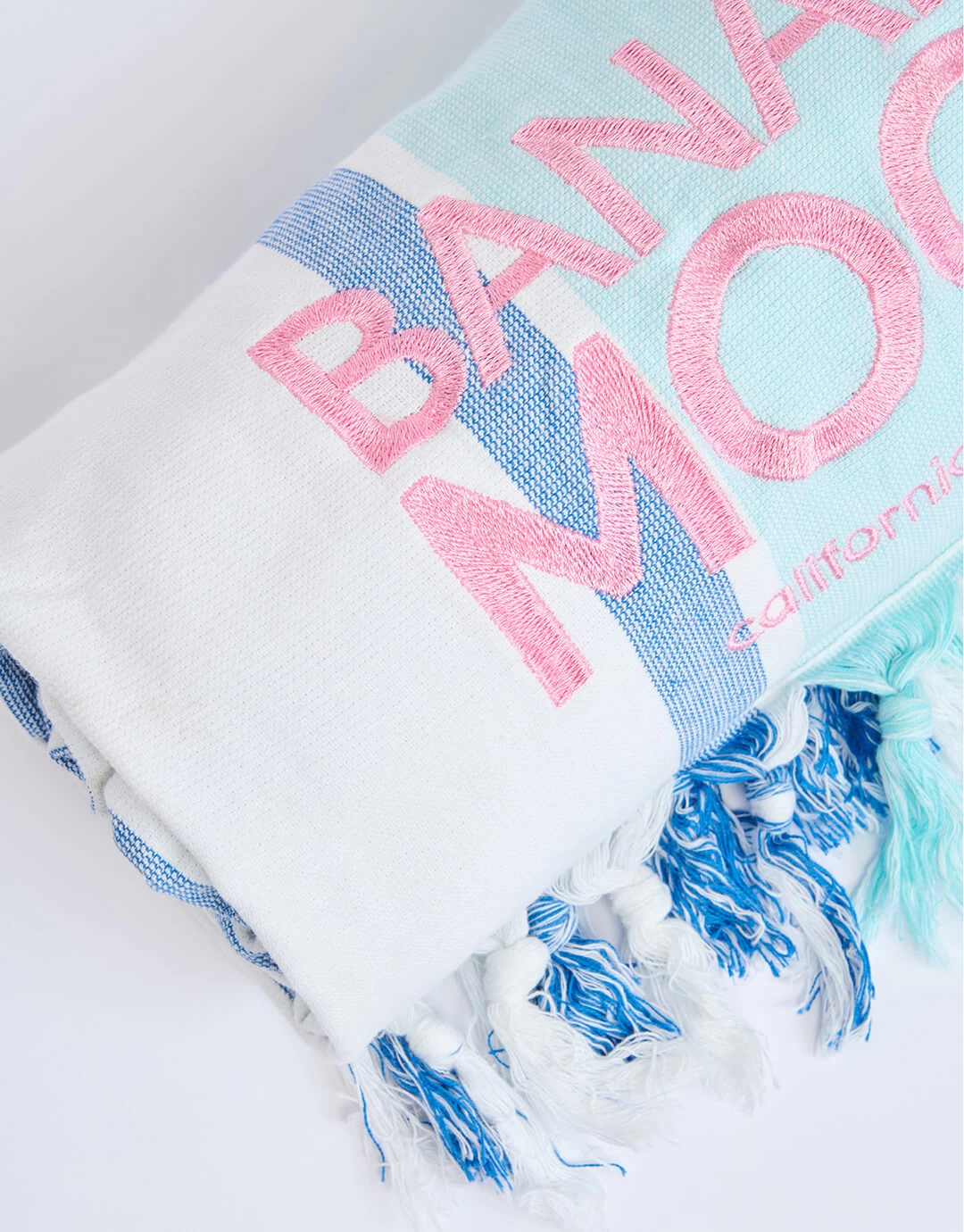 The Marbella Willian towel from Banana is a lovely blue and white striped Hammam-style cotton towel with tasseled edging and contrasting pink Banana Moon logo.