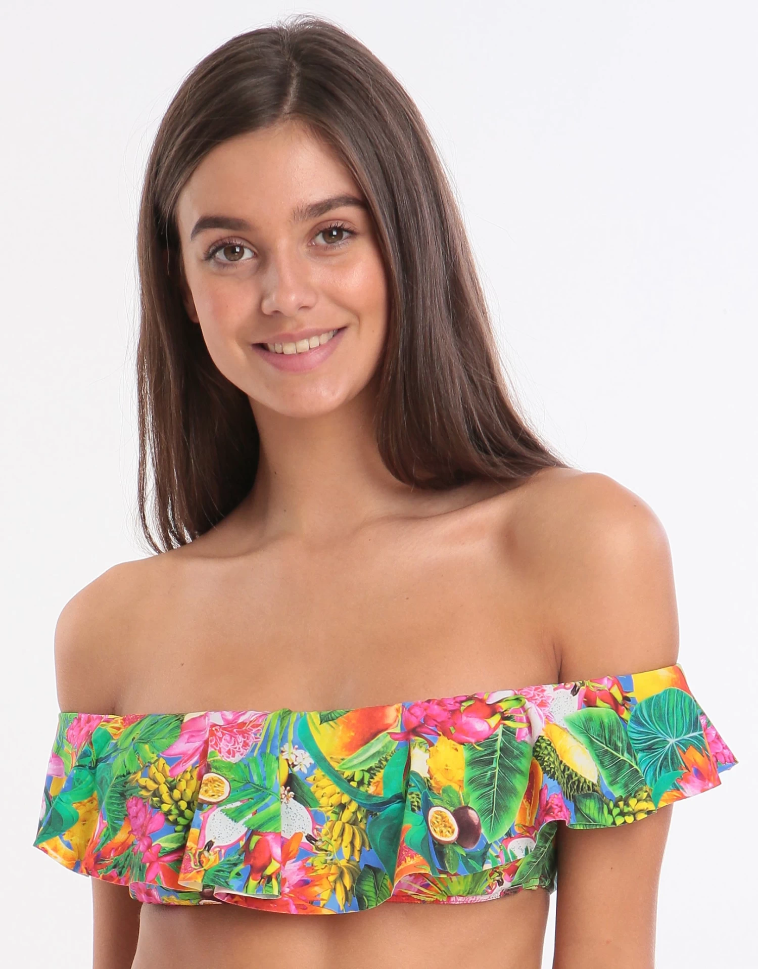 Make a statement in Banana Moon’s Tropicool Tolvo Off The Shoulder Bikini Top. With its strapless style and fun frilly edging, this bikini top is sure to impress and be your must-have style this holiday season. Â