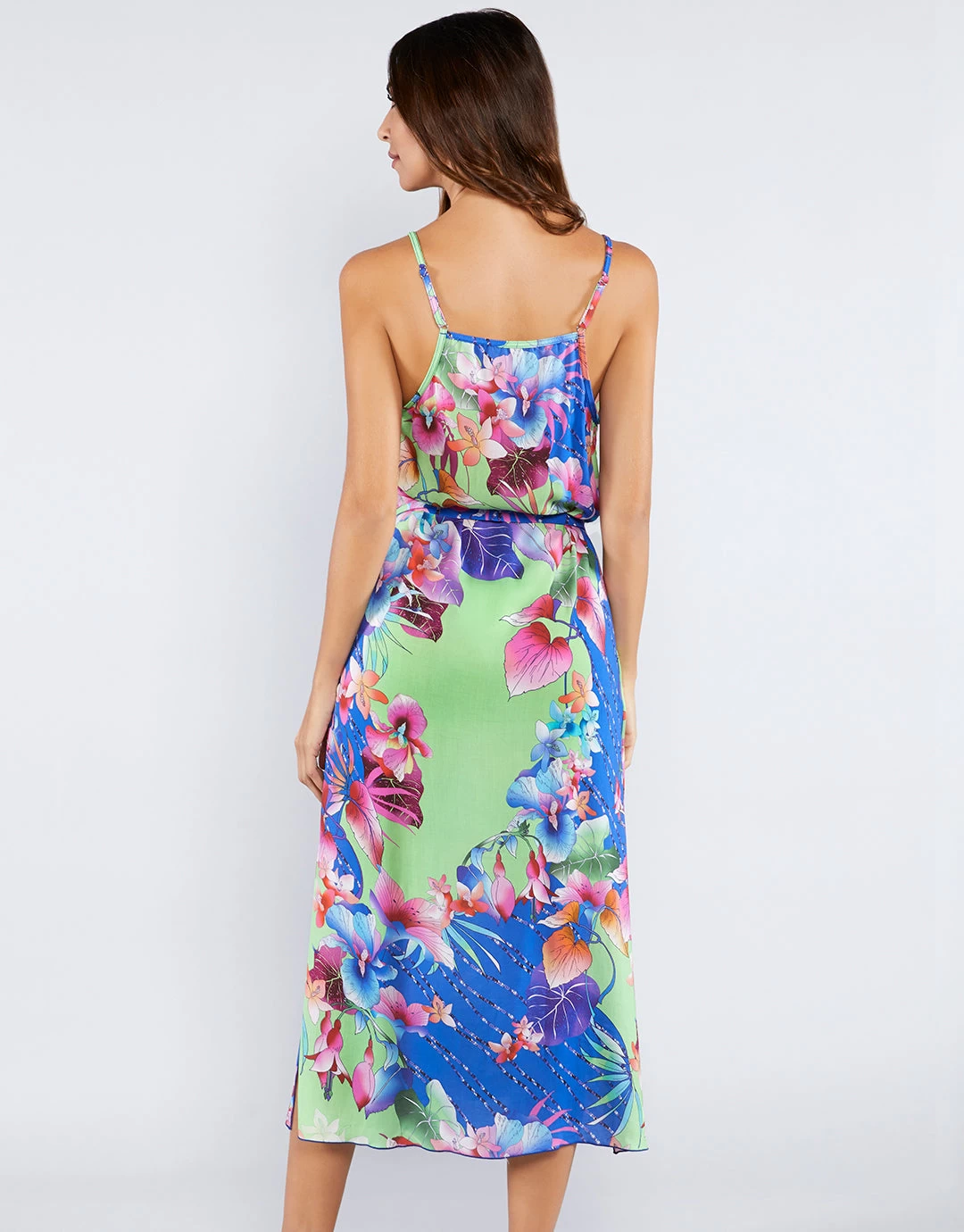 This gorgeous Camila maxi dress from Nuria Ferrer is a brilliant cover up to match the swimwear in the same vibrant green and blue floral print. With thin straps and a slim fit with tie to cinch the waist.