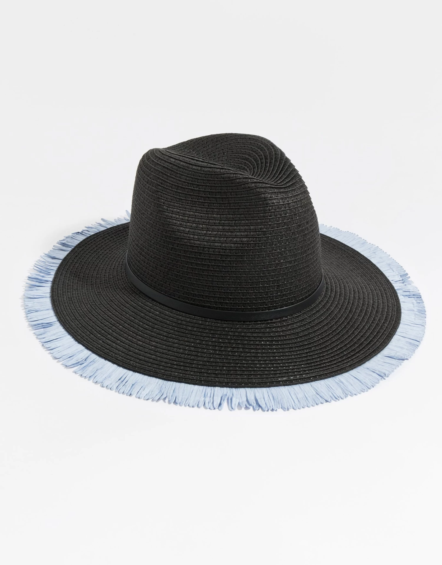 Be a trendsetter in Pia Rossini’s Black and Blue Cira Beach Hat. With raw edging, this chic hat is sure to be your must have holiday accessory this season.
