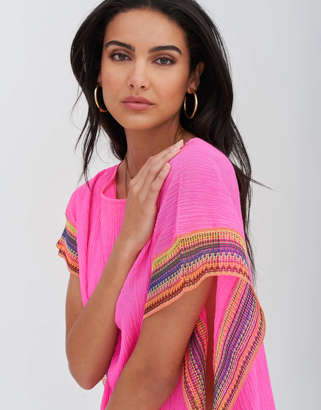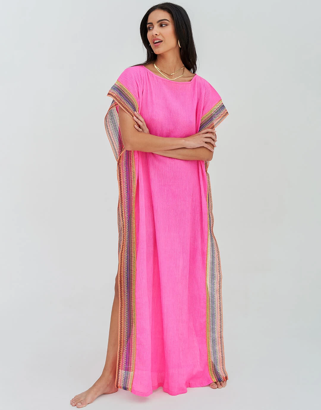 The Crinkle Maxi Kaftan from Pitusa is a great maxi-length style with a round neck and wide Inca trim detailing to the open sides which are fixed at one point around hip height. Available in Standard or Petite lengths. Choose Standard if you’re over 5ft 4in and Petite if you’re under.