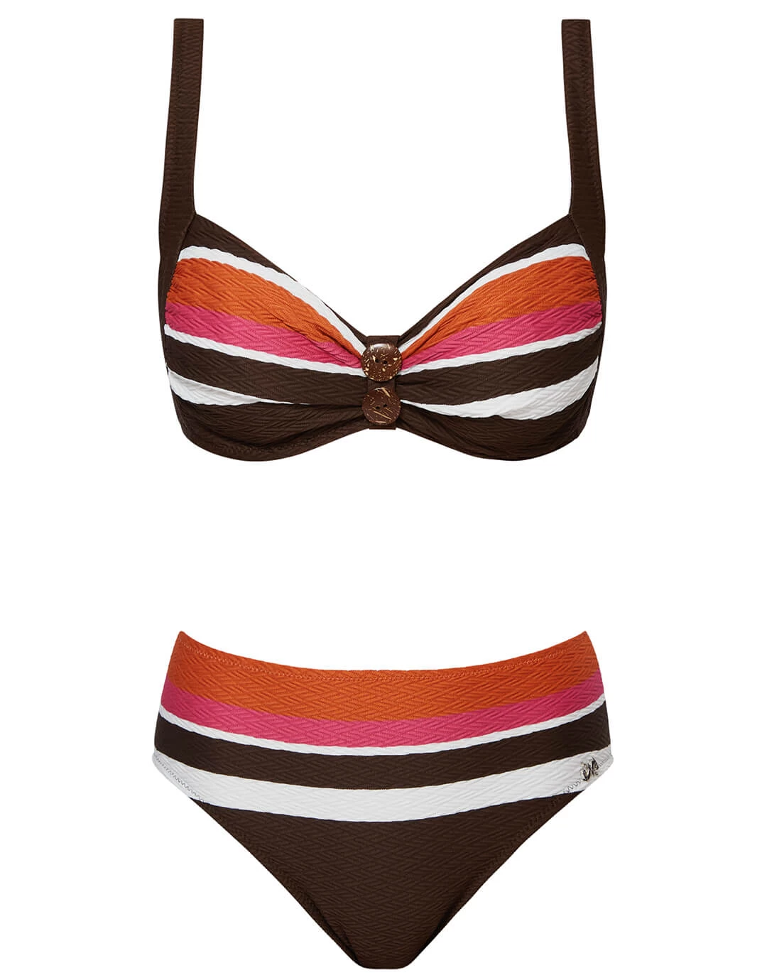 The Eden Underwired bikini from Nuria Ferrer is a bold stripe design in chocolate brown, pink, orange and white textured fabric. This bikini comes as a set and includes underwire and adjustable straps on the bikini top, with double button detail at the centre and the pant is has full-coverage and tummy control.