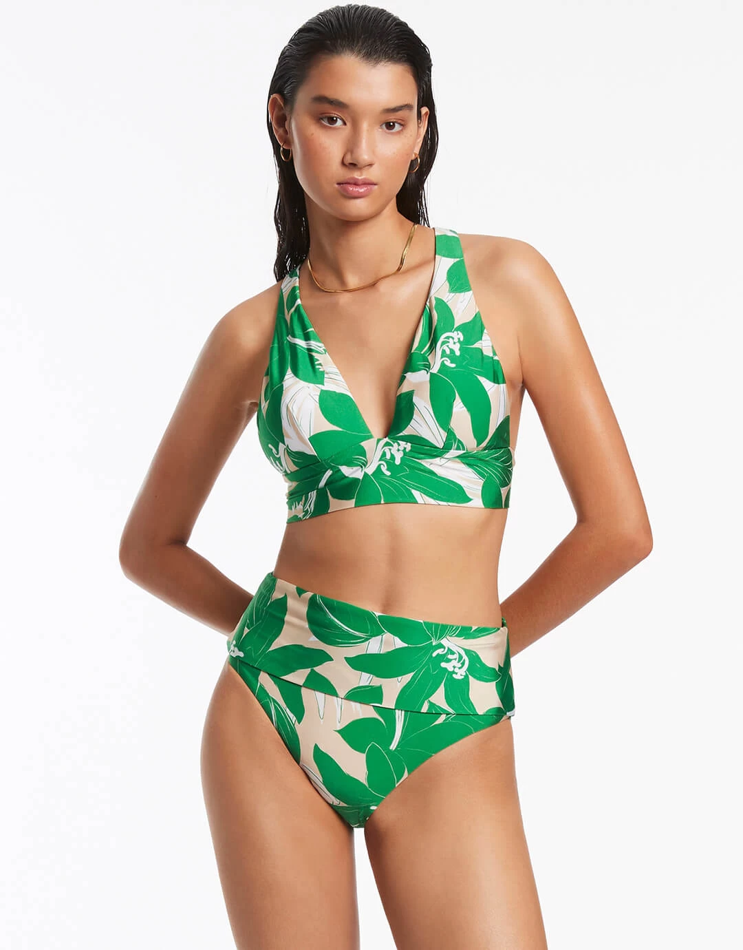 The Floreale Fold Down bikini pant from Jets is a gorgeous green and cream print bikini pant with maximum coverage at the back and waist with a deep folded waistband which can be adjusted for the perfect fit and coverage.