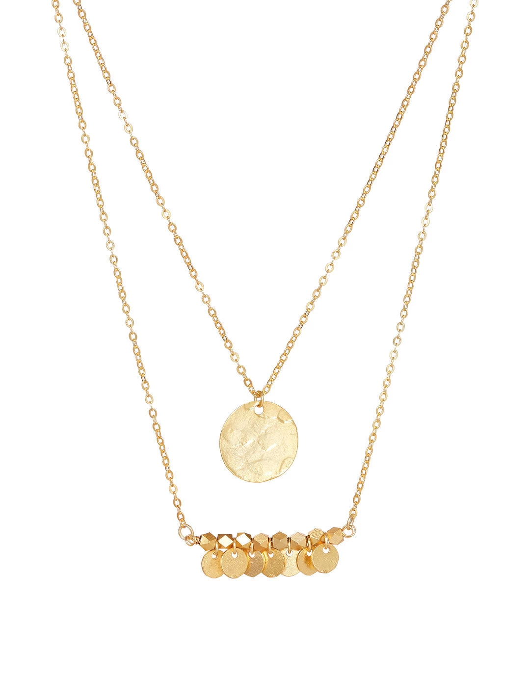 The Ashiana Greek Island Necklace is a 22k gold plated double chain design measuring 49.5cm or 19.5″ from end to end embellished with chic beaten discs, a perfect finishing touch to your summer look.