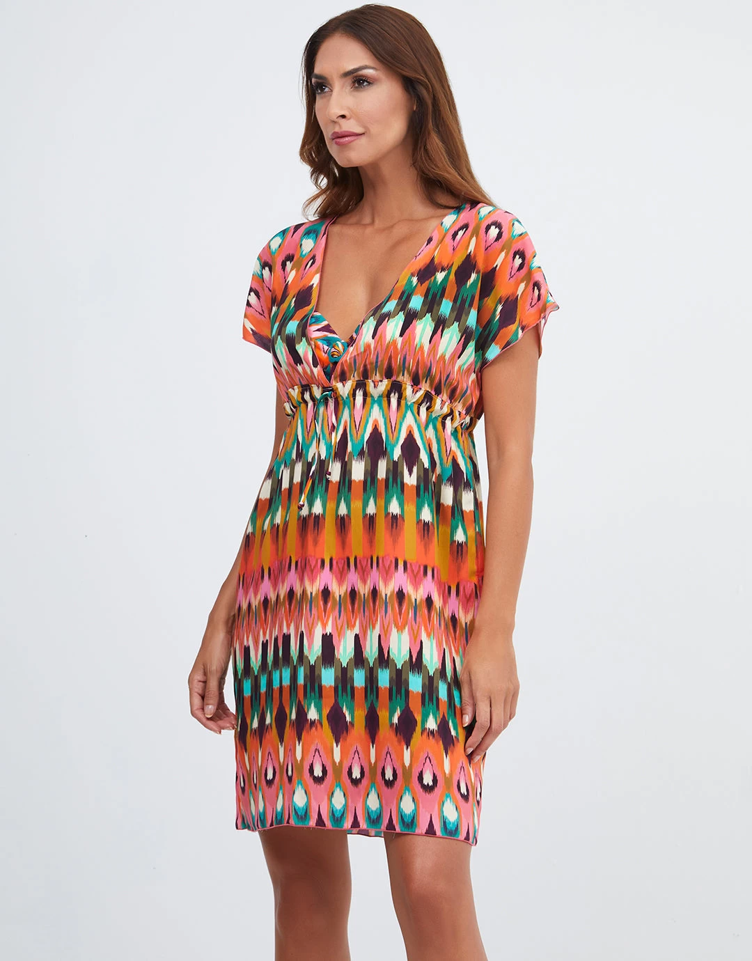The Ipanema Beach dress from Nuria Ferrer is a pretty short-sleeved, V-neck mini dress with a drawstring tie under the bust to cinch the waist.