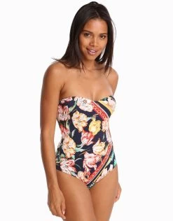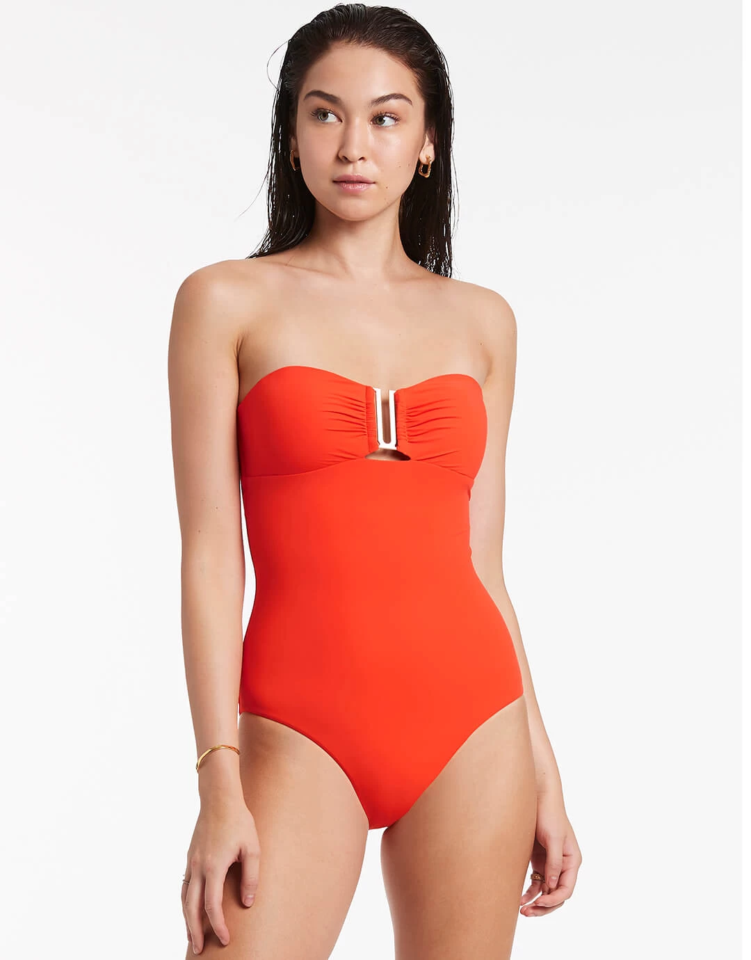 The Jetset Bandeau swimsuit from Jets is a classic bandeau shape with removable cups for shape and support and an elegant U-shaped gold colour metallic feature at the bust.