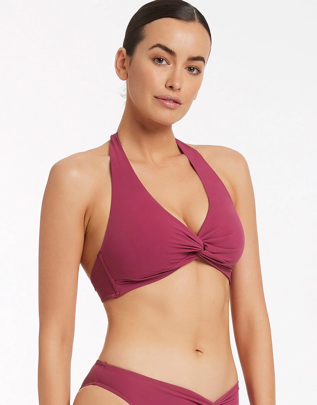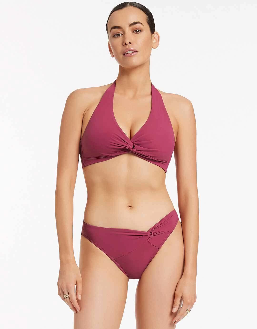 The Jetset D DD Twist Front bikini top in Orchid pink from Jets is their classic halter style with ties at the back and neck for an easy fit. The front has a looped though twist detail and inside there are removable cups and hidden mesh for great support.