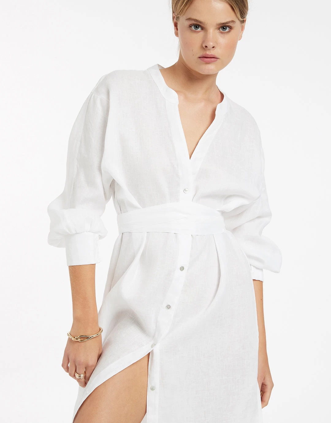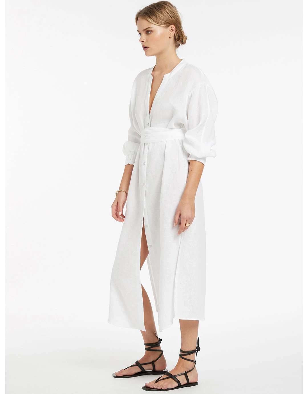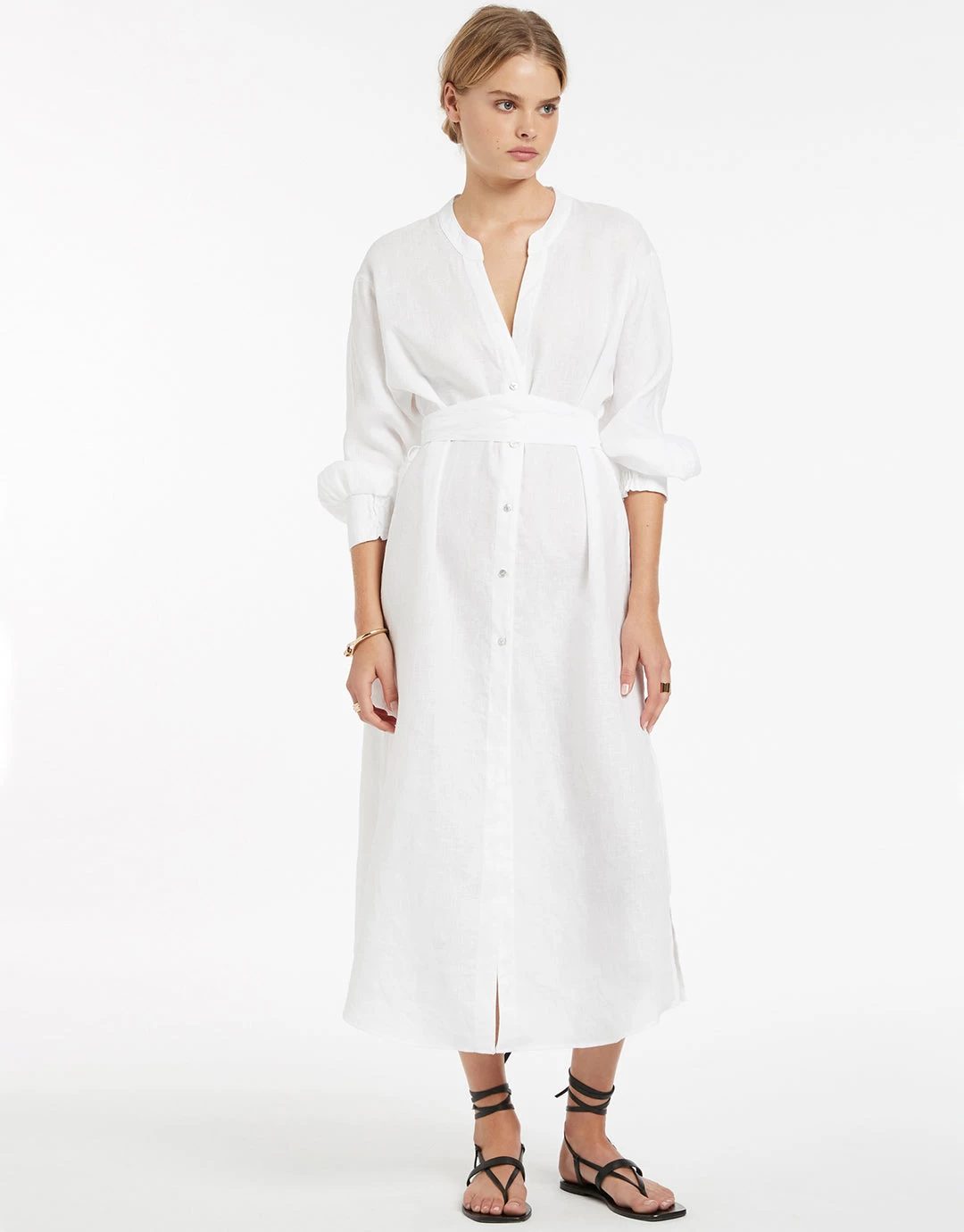 The Jetset Shirred Cuff Shirtdress from Jets is a lovely ankle-length soft linen button-through dress, with a soft Nehru collar, cuffed dolman sleeves, side slits to the thigh and a wide tie at the waist.