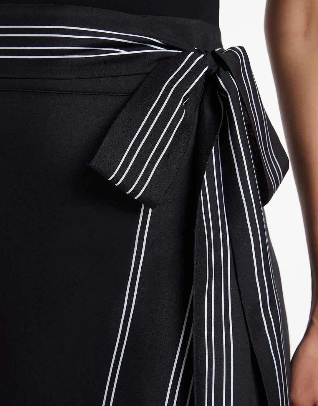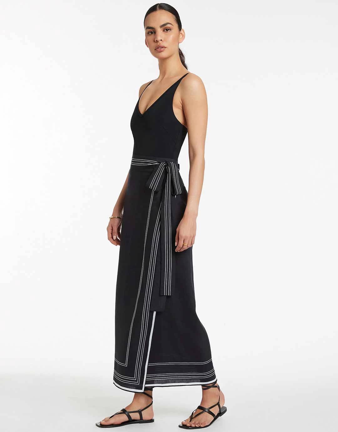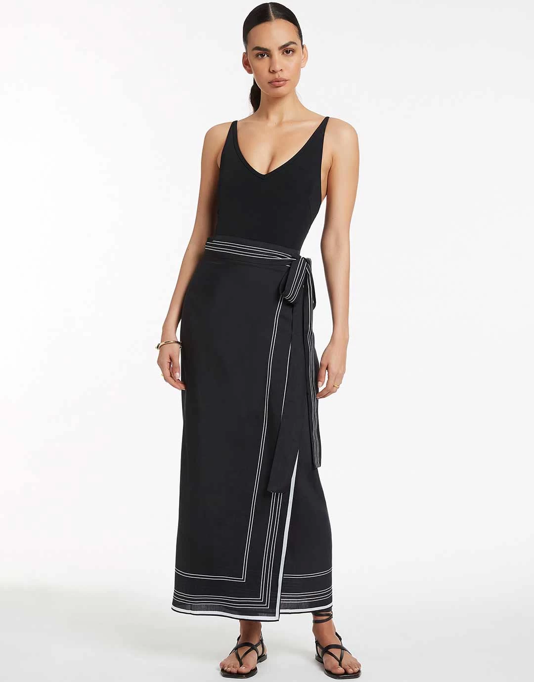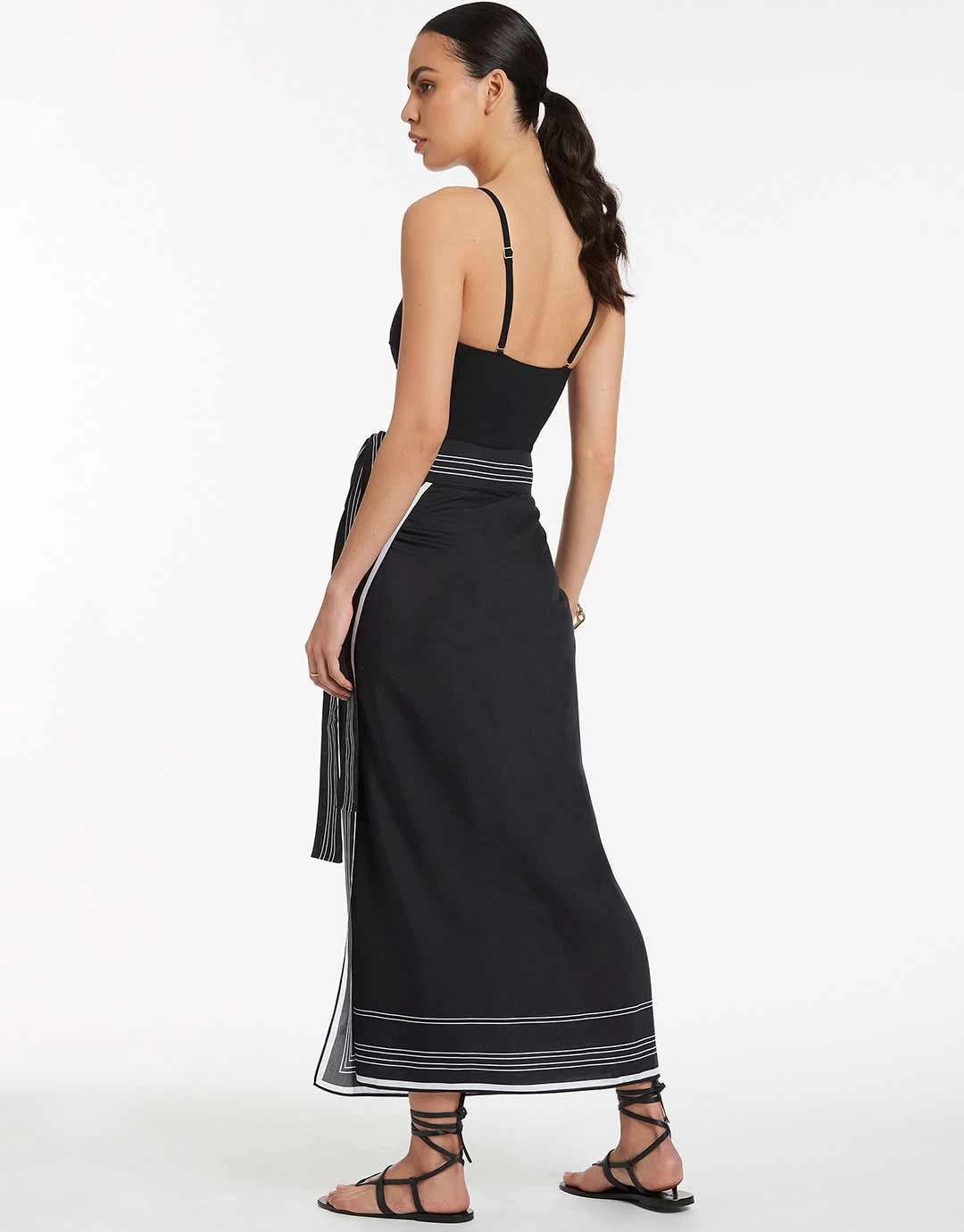 The elegant Jetset Tie Sarong from Jets is a long black sarong with white striped border and long ribbon tabs to tie.