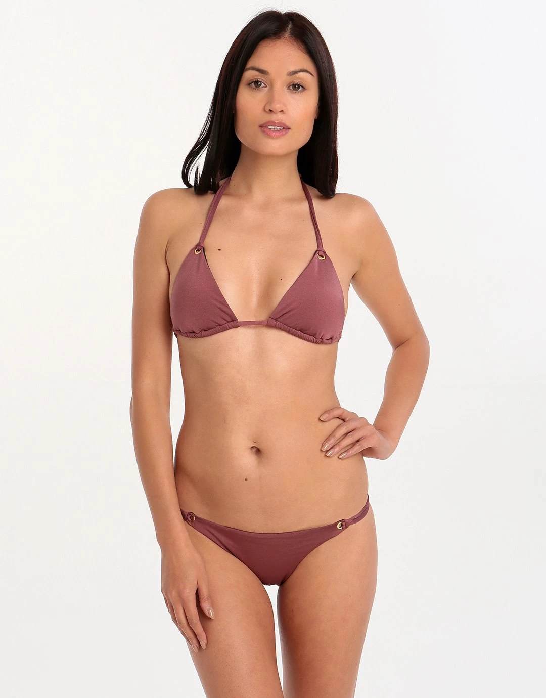 Ooze beach glamour in this dark dusty rose Heidi Klum Swim Majestic Shimmer String Side Pant with its luxurious semi shimmer fabric and chic gold eyelet detail on the hips. This bikini pant gives medium coverage on the rear and small coverage on the hips making it a perfect sunbathing option.