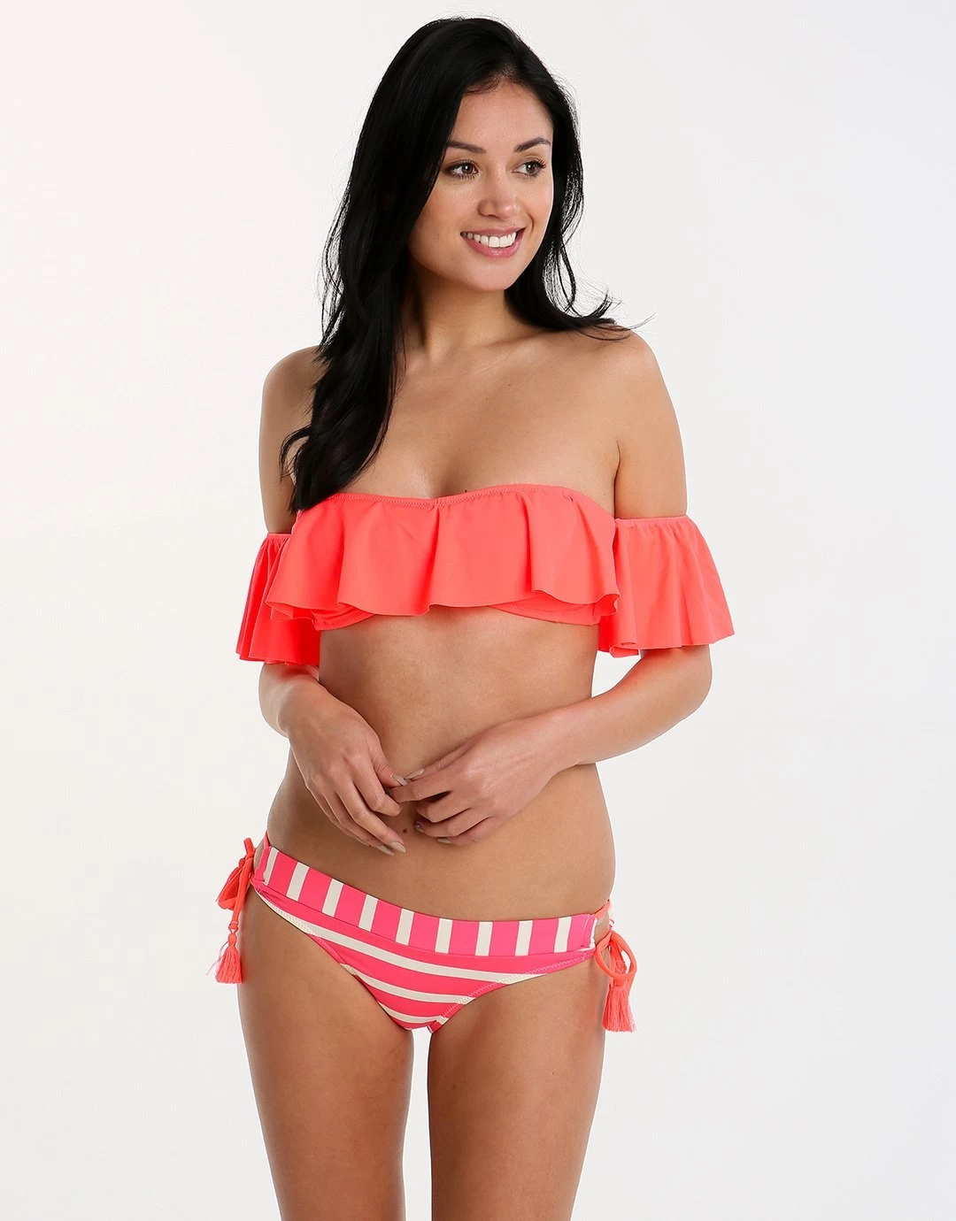 Dare to bare in the Maracas Bay Brazilian Back Loop Tie Pant from Phax. This sexy stripe brazilian bikini pant gives cut away coverage at the rear and is finished with cute tassel trim detail on the side ties.