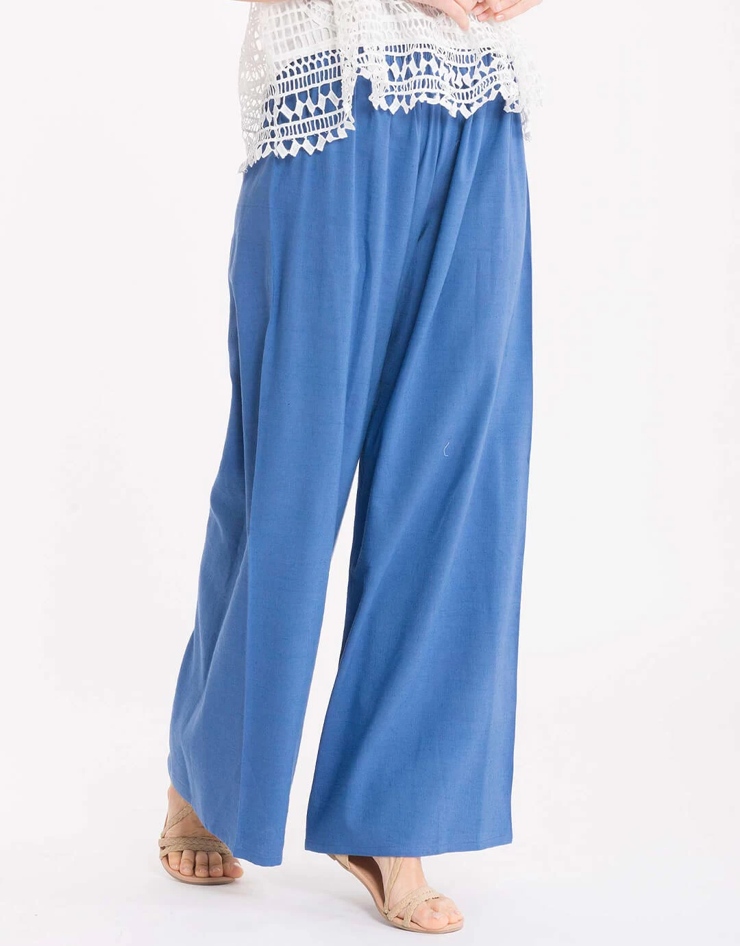 The Palazzo Pants from Iconique are a beautiful mid-blue wide-leg trouser with an elasticated waist.