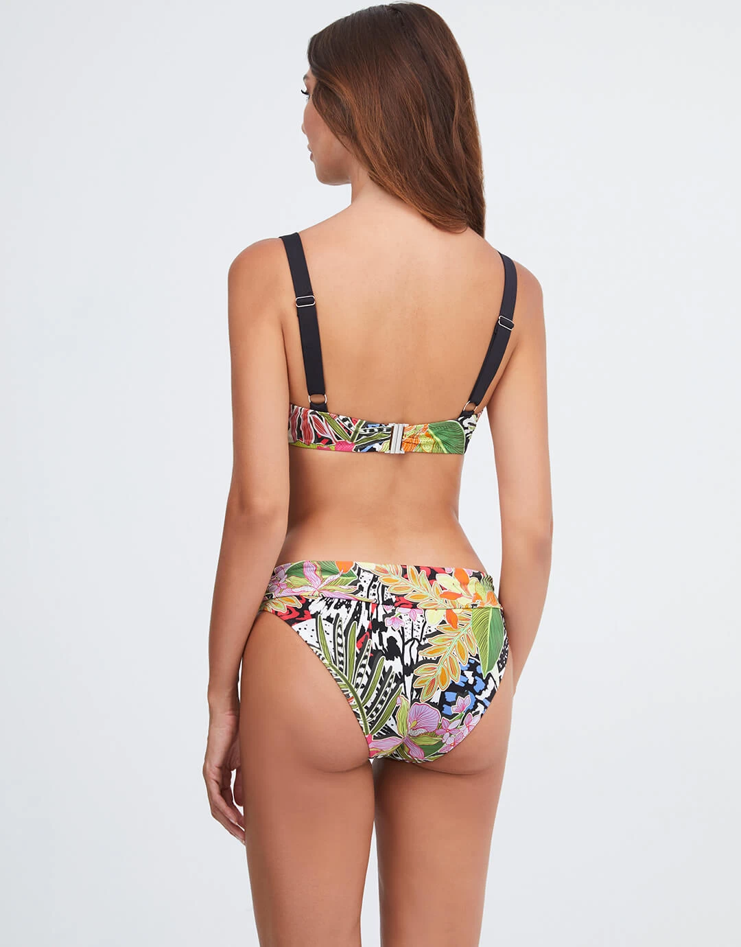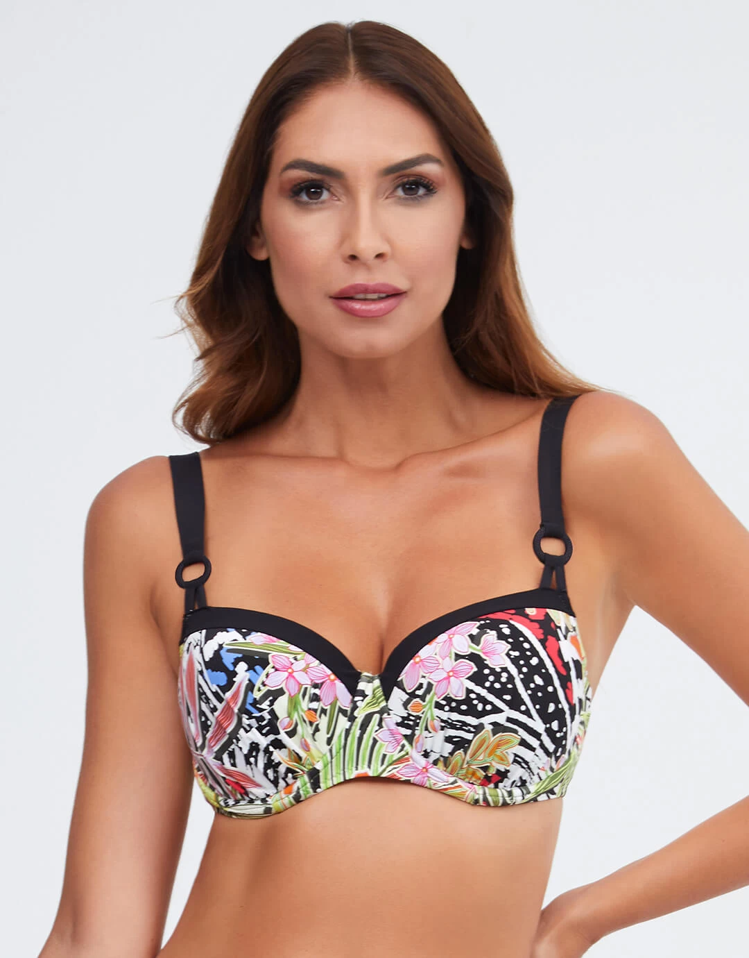 The Palm Underwired Balcony bikini top from Nuria Ferrer is a lovely colourful style with comfortable, contrasting wide adjustable straps featuring ring detailing, soft moulded and underwired cups and a clip at the back.