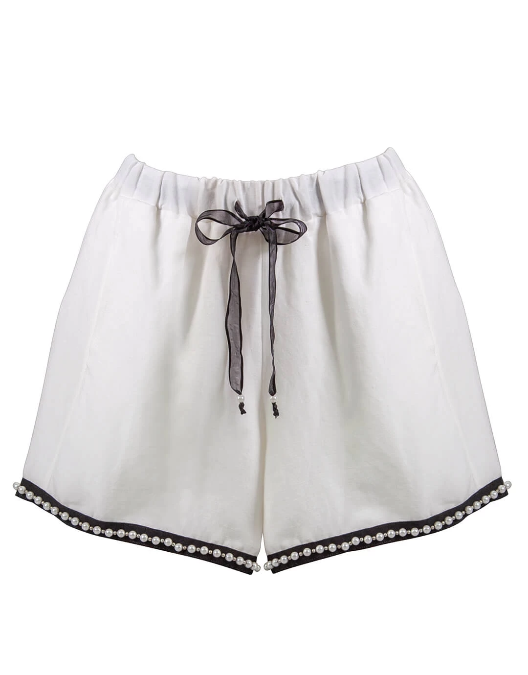 The Pearl shorts from Maryan Mehlhorn are made from a soft viscose linen mix. Gathered with wide elastic in the waistband and with a sheer ribbon tie. The shorts are loosely cut and fully lined, with side pockets and are finished with contrasting black binding and adorned with pearled and tiny silver beads along the edge and at the ends of the ribbon tie.