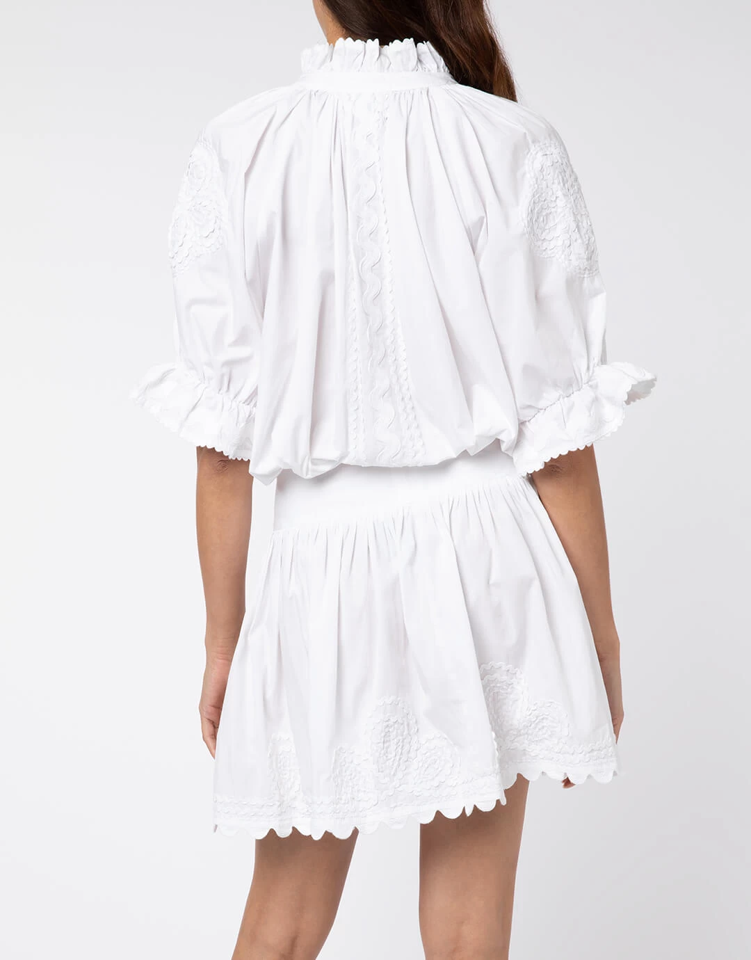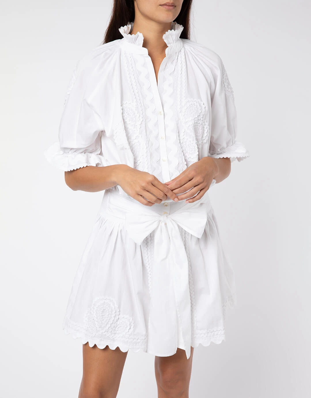 The Poplin Blouson Dress with Ric-Rac Embroidery from Juliet Dunn in crisp white is a mini length dress with a buttoned front, elbow-length gathered sleeves and the neck is finished with a fluted collar. This dress can be worn loose and low at the hips or higher at the waist and cinched with the adjustable waist ties. Ric-Rac edging adds an elegant scalloped detail to the hems.