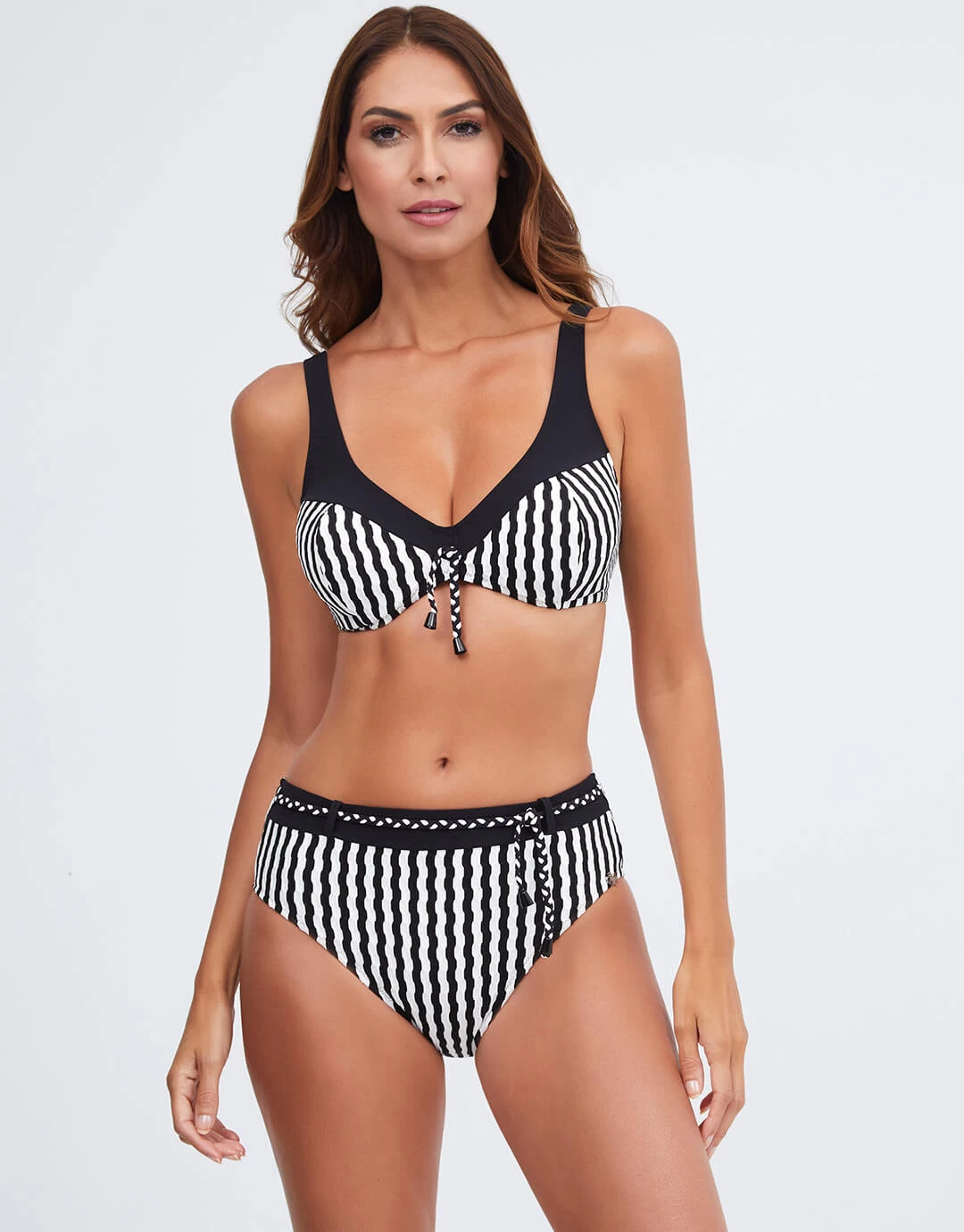 The Portofino Maxi Bikini pant from Nuria Ferrer is a great full coverage pant in the lovely black and white striped textured Portofino fabric. With a black waistband and woven black and white tie belt detail.