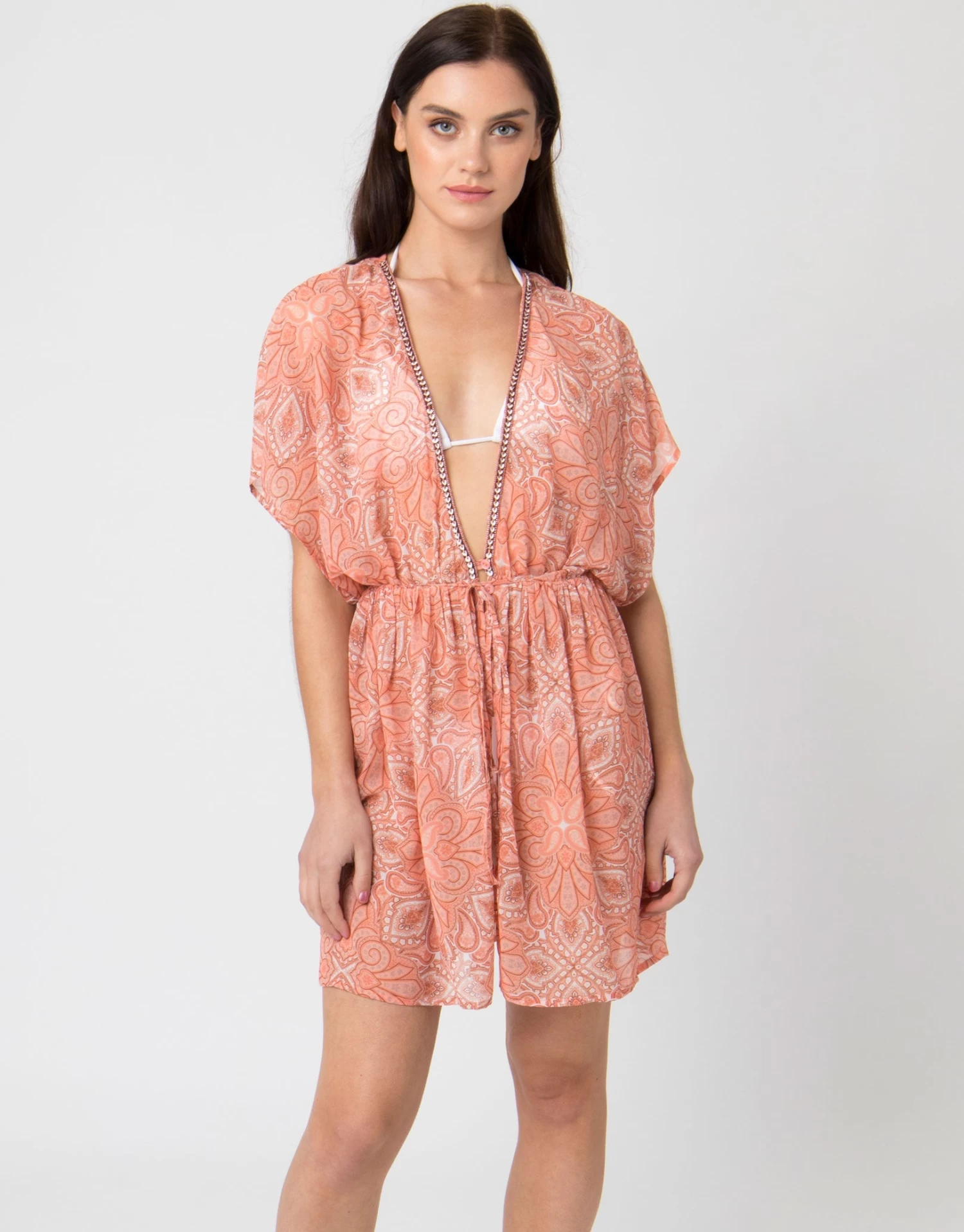 Be a trendsetter this holiday season wearing Pia Rossini’s Rhodes Kaftan in a stunning coral.
