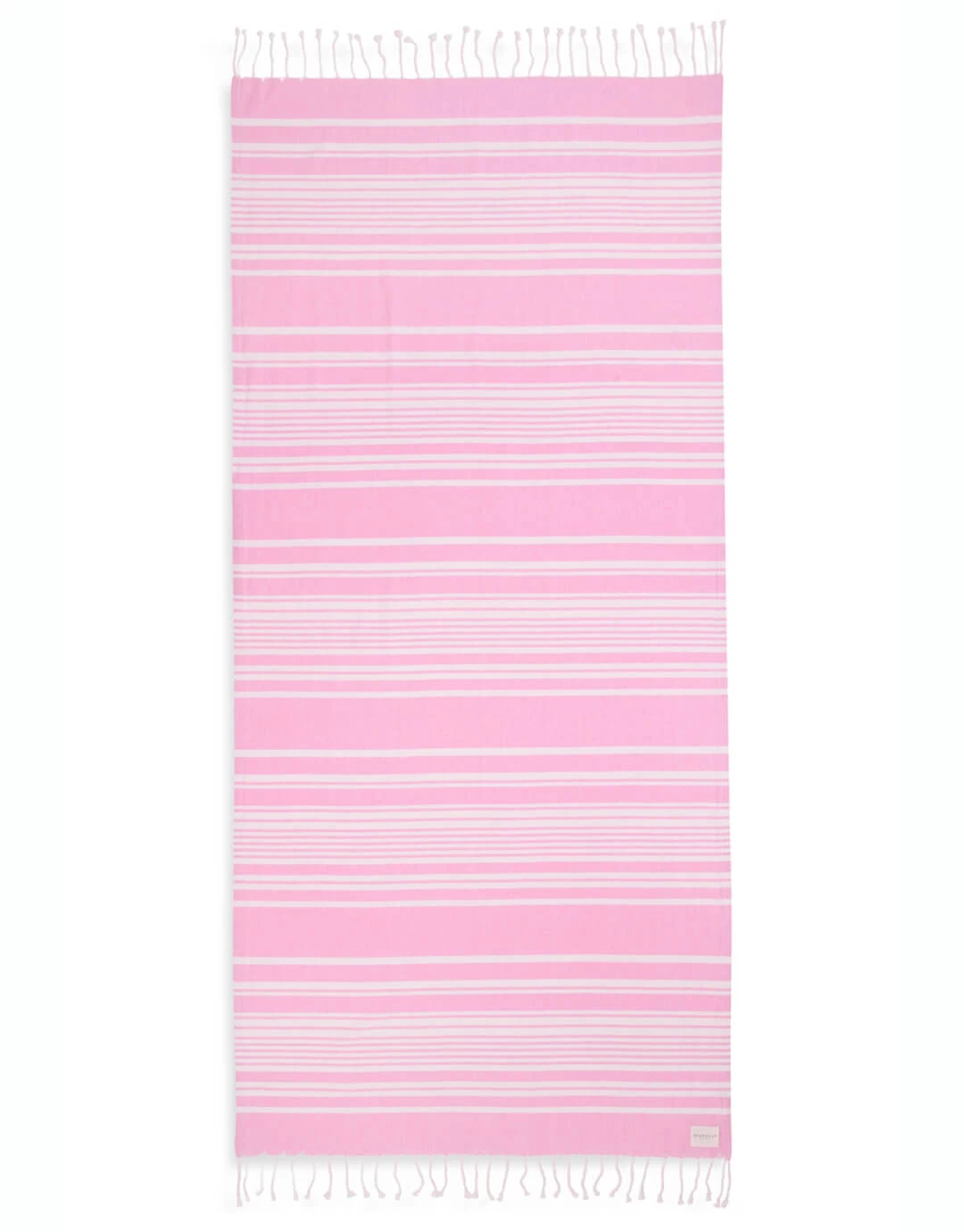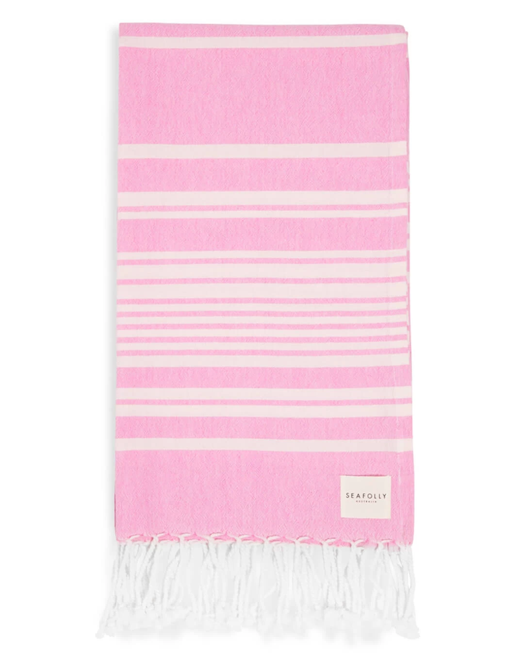This handy Turkish towel from Seafolly comes in it’s own matching bag. In pretty pink colour, the towel and the bag are made from the same 100% soft cotton, woven in a pink and white stripe design and both are finished with white tassels.