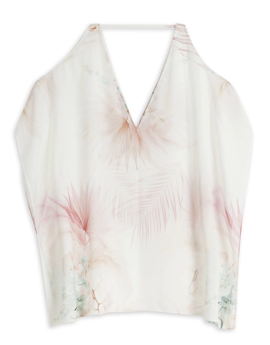 The Natalli Square V-Neck cover up from Ted Baker is a floaty, cold shoulder kaftan in pale pink floral on white.Â