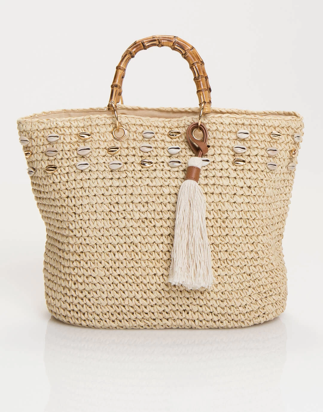 The lovely Tivoli bag from Pia Rossini is a beautiful raffia look summer bag made from woven paper straw, with a bamboo handle, shell detailing and a tassel detail.