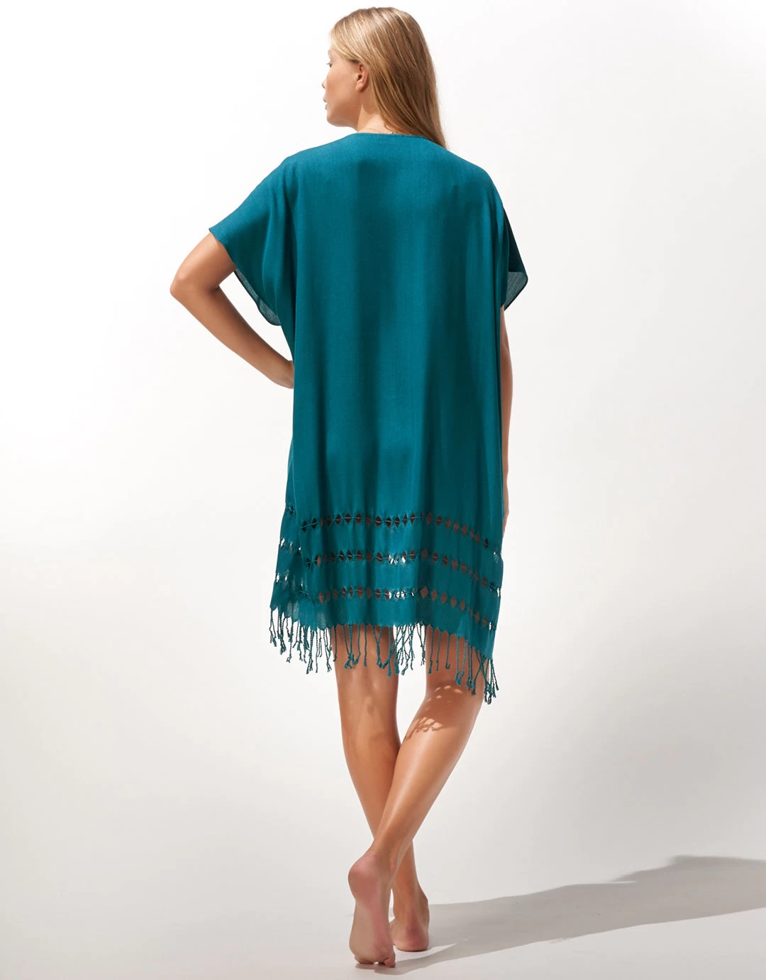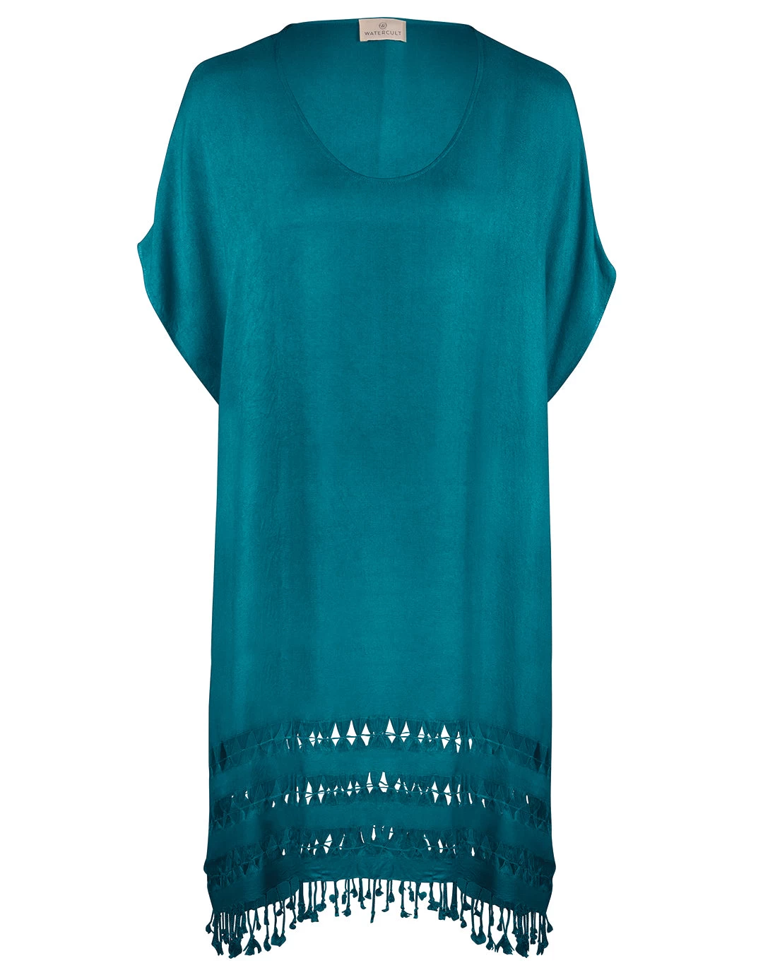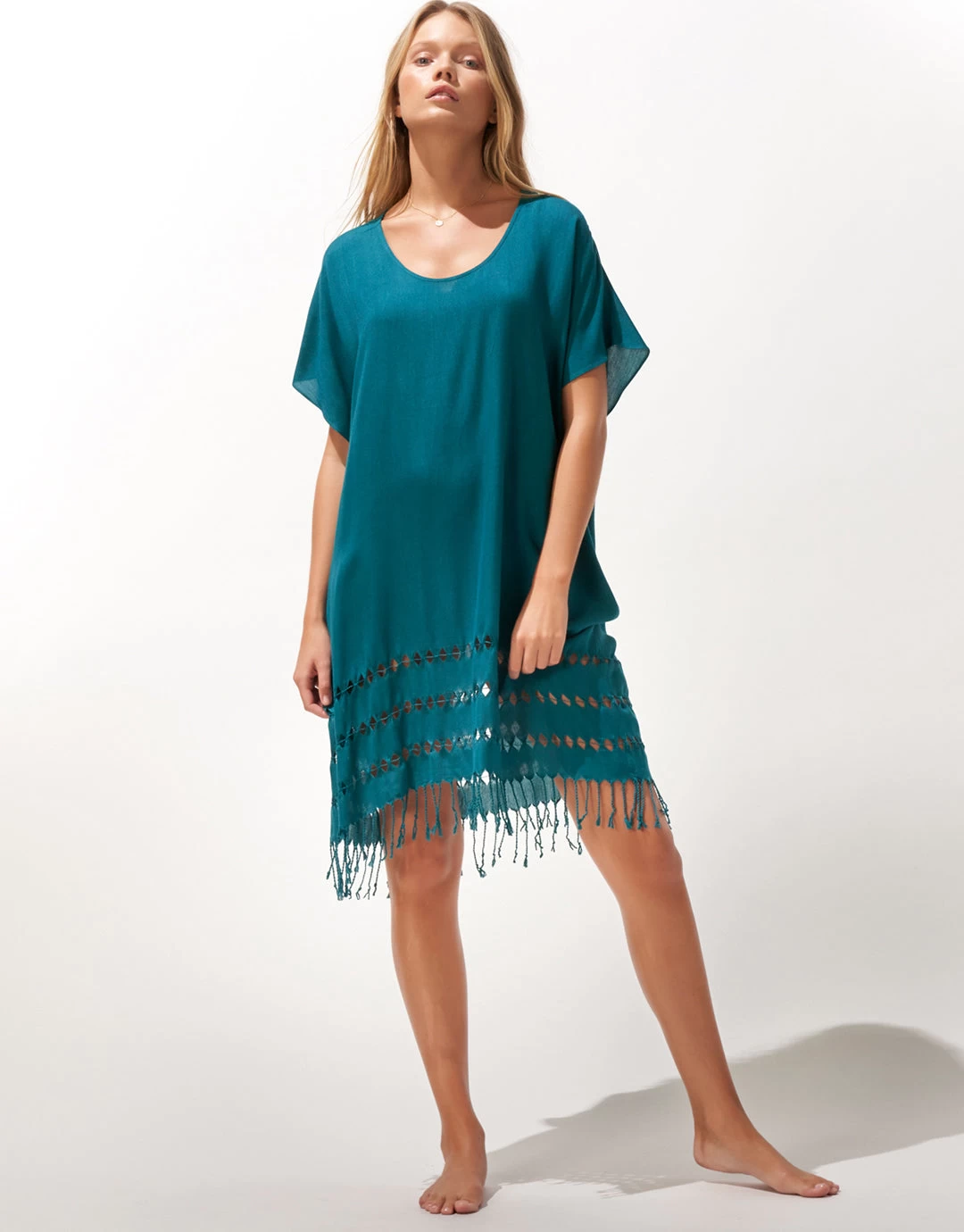 The HERO ESSENTIALS tunic kaftan is a lightweight midi length tunic made from soft  viscose fabric. Delicate tassels decorate the hem. Round neckline and dropped, short sleeves; this style comes in deep black or hydro green.